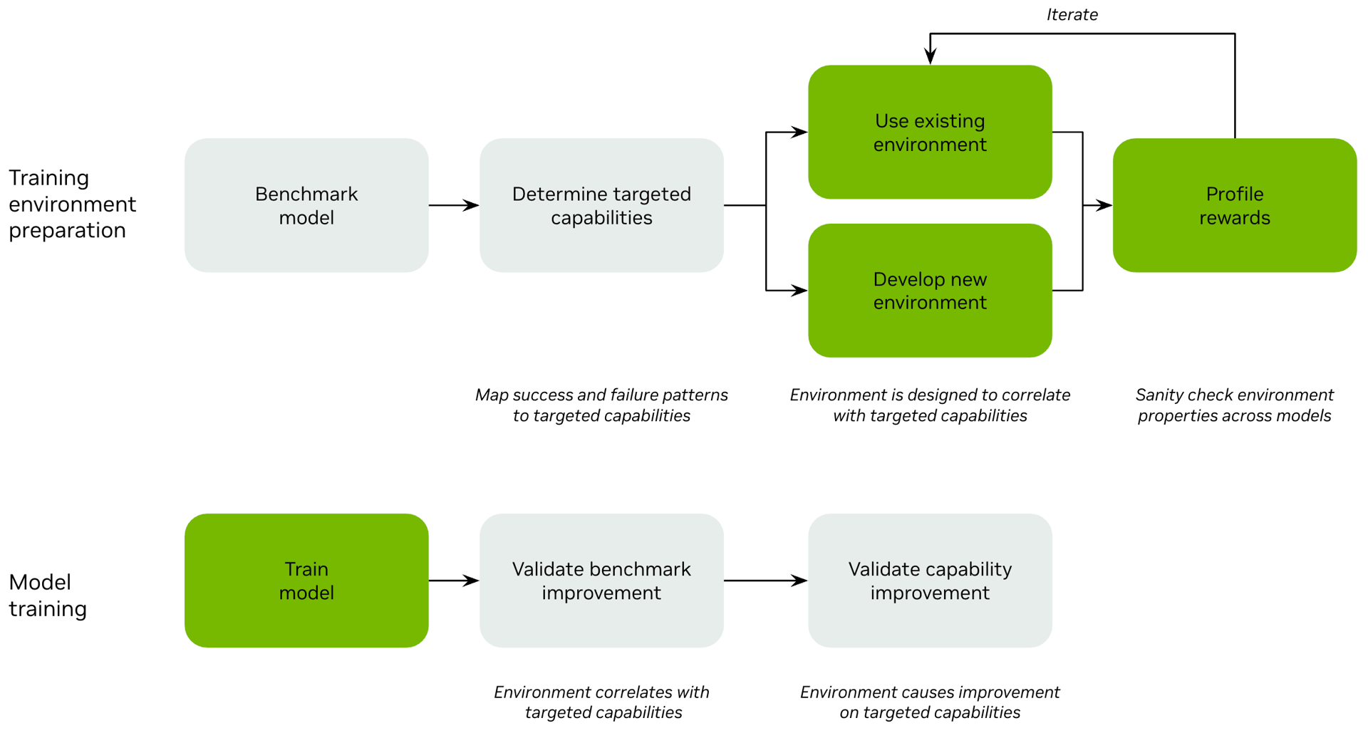 For the purposes of this blog post, we will assume that you have a good understanding of the capability or benchmark you want to see the model improve on. The following section covers specifically concepts around Phase 1.3 above, that is, building an environment.