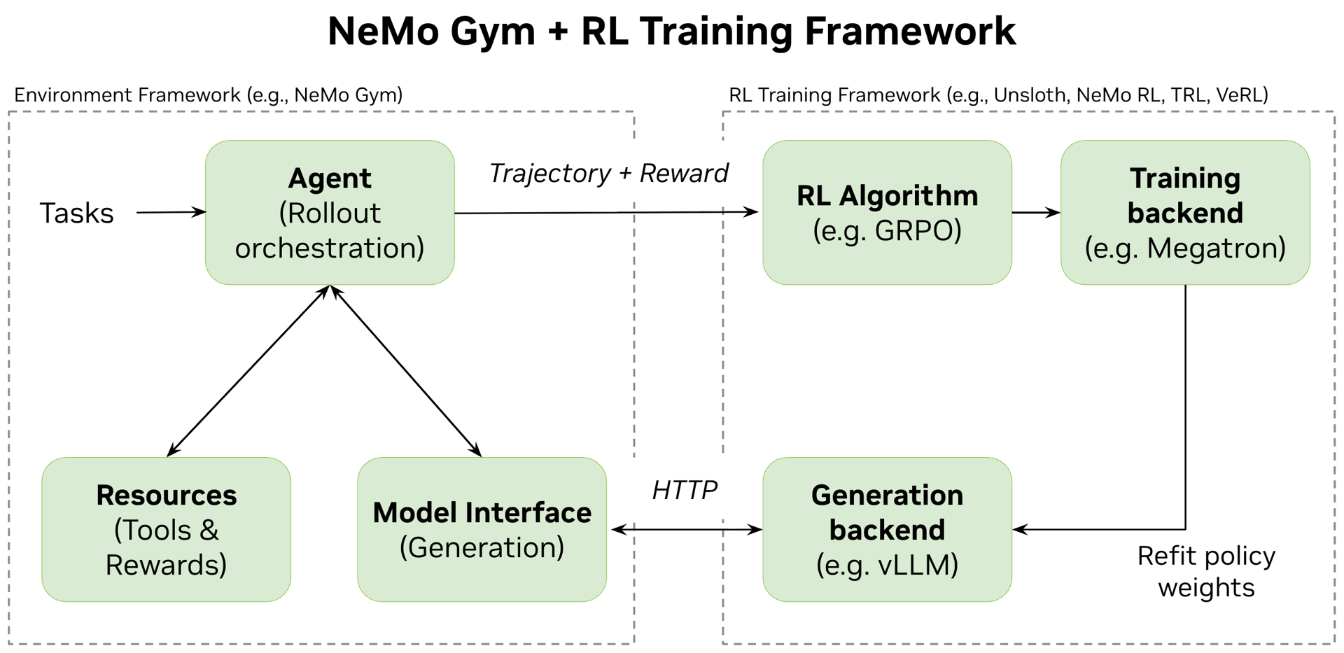 Figure 1: The architecture of NeMo Gym that works alongside an RL training framework, illustrating the decoupling of environment rollout orchestration from model training and generation.