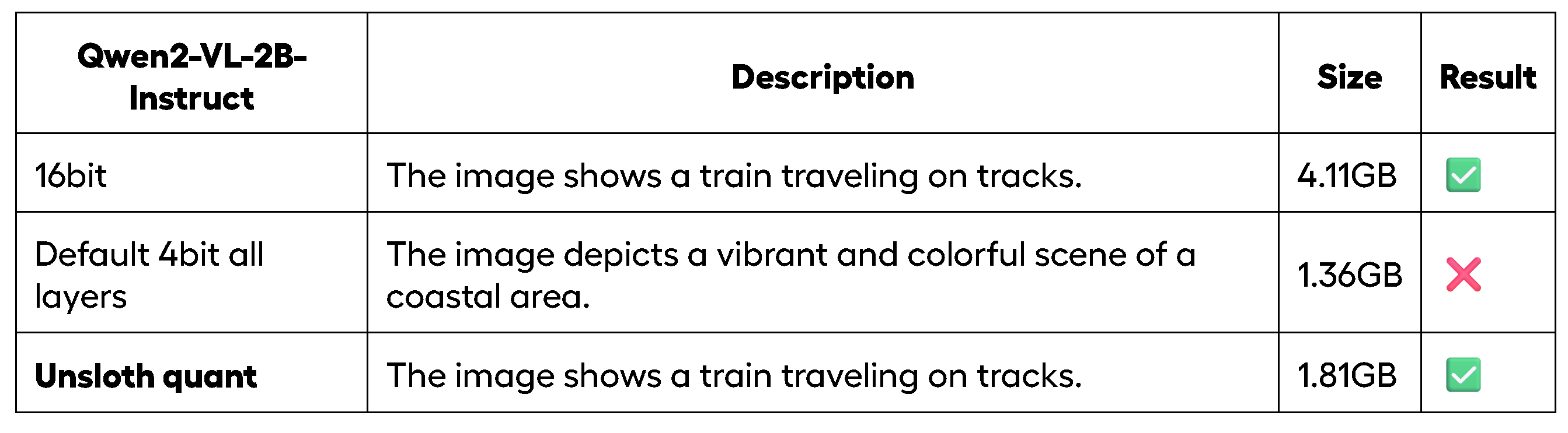 For example in Qwen2-VL-2B-Instruct, naively quantizing all layers to 4bit causes the model to fail understanding the image below. It's a train, not a coastal scene!