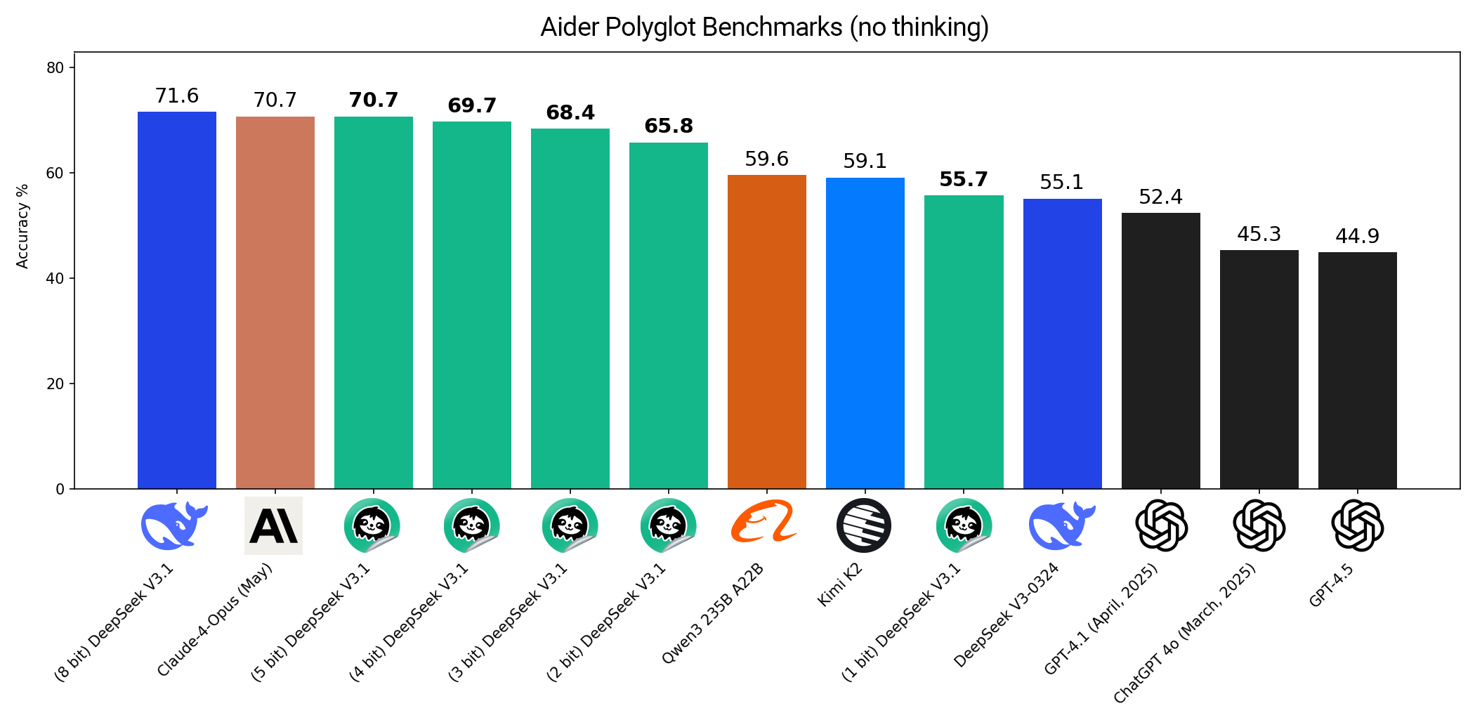 * **5-bit** Unsloth DeepSeek-V3.1 (non-thinking) GGUF: Matches Claude-4-Opus-20250514 (non-thinking) performance.