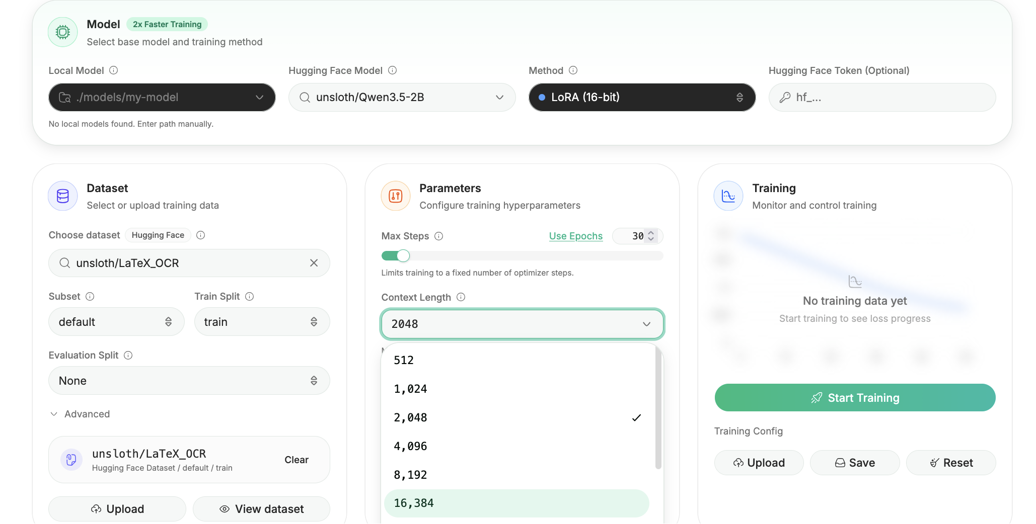 Recherchez Qwen3.5 dans la barre de recherche et sélectionnez le modèle et le jeu de données souhaités. Ensuite, ajustez vos hyperparamètres et la longueur du contexte selon vos besoins.