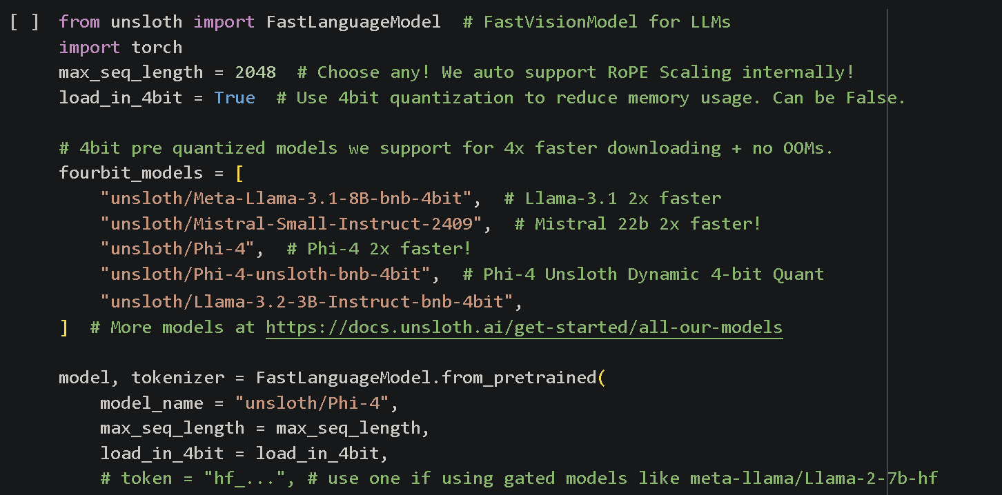 * **`load_in_4bit = True`** – Enables 4-bit quantization, reducing memory use 4× for fine-tuning. Disabling it enables LoRA 16-bit fine-tuning. You can also enable 16-bit LoRA with `load_in_16bit = True`