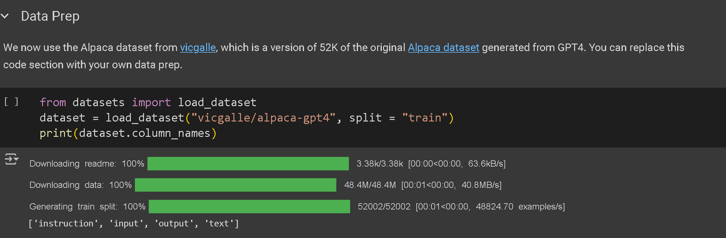 * Select the output or target / prediction column in `output_column_name`. For the Alpaca dataset, this will be `output`.