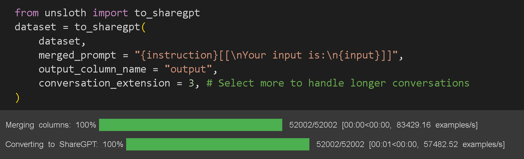 So we introduced the `conversation_extension` parameter, which essentially selects some random rows in your single turn dataset, and merges them into 1 conversation! For example, if you set it to 3, we randomly select 3 rows and merge them into 1! Setting them too long can make training slower, but could make your chatbot and final finetune much better!