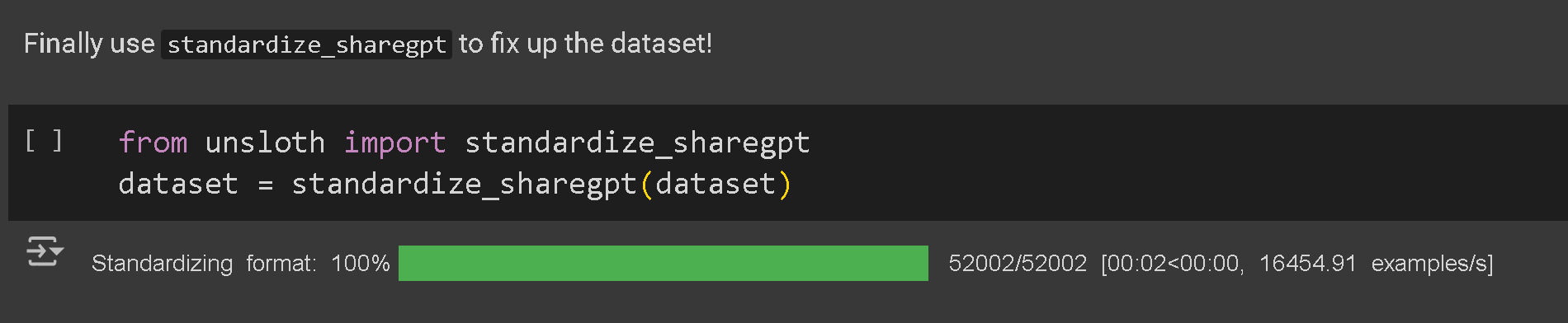We then use the `standardize_sharegpt` function to just make the dataset in a correct format for finetuning! Always call this!