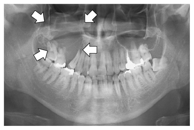 | <img src="https://3215535692-files.gitbook.io/~/files/v0/b/gitbook-x-prod.appspot.com/o/spaces%2FxhOjnexMCB3dmuQFQ2Zq%2Fuploads%2Fgit-blob-97d4489827403bd4795494f33d01a10979788c30%2Fxray.png?alt=media" alt="" data-size="original"> | Panoramic radiography shows an osteolytic lesion in the right posterior maxilla with resorption of the floor of the maxillary sinus (arrows). |