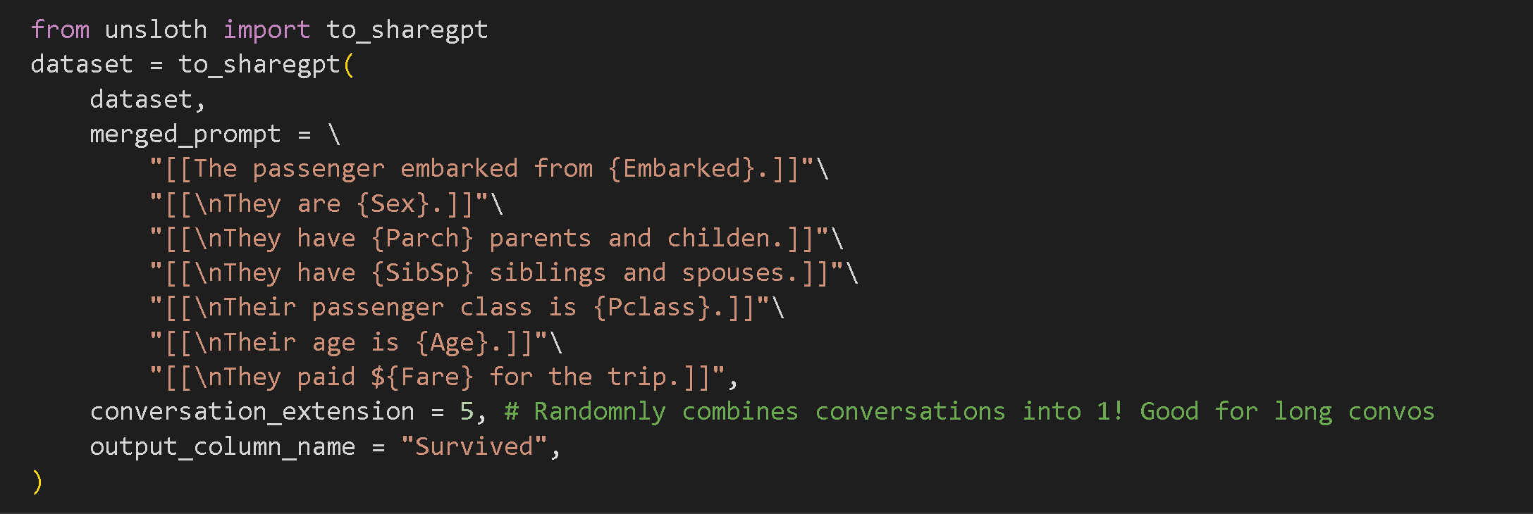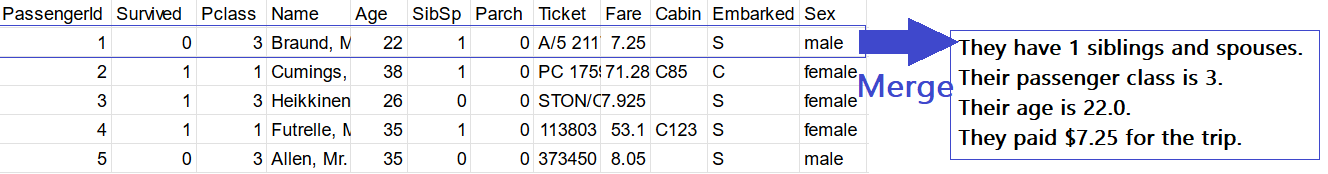 For example in the Titanic dataset, we can create a large merged prompt format like below, where each column / piece of text becomes optional.