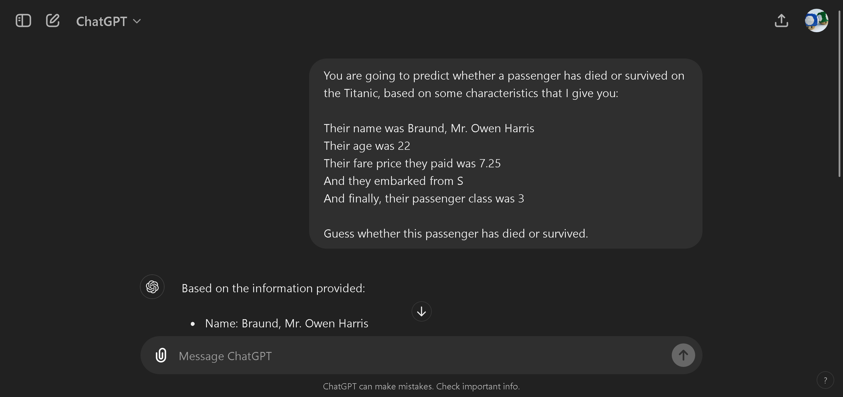 For example, if we ask ChatGPT with our "merged" single prompt which includes all the information for that passenger, we can then ask it to guess or predict whether the passenger has died or survived.