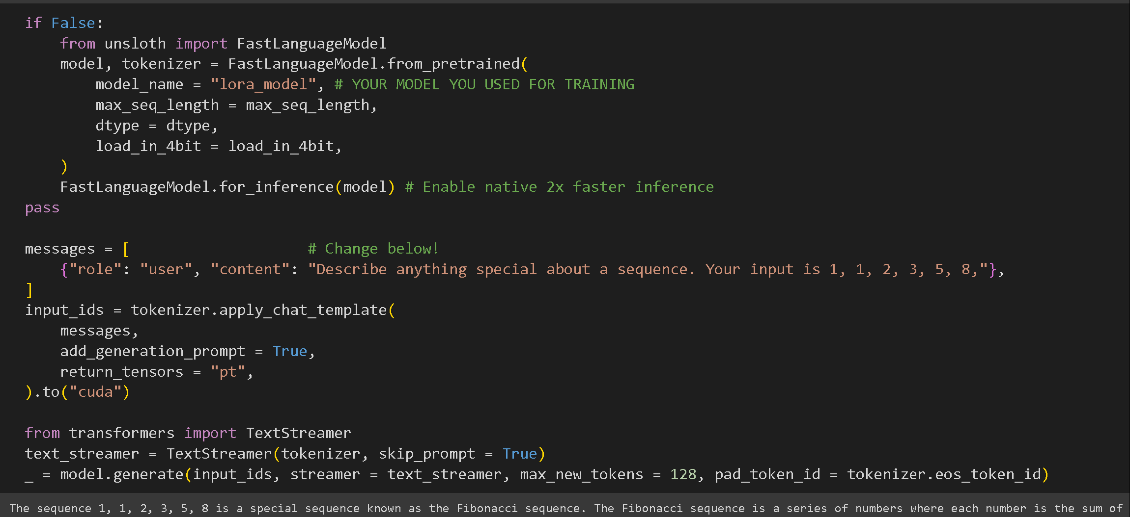 After saving the model, we can again use Unsloth to run the model itself! Use `FastLanguageModel` again to call it for inference!
