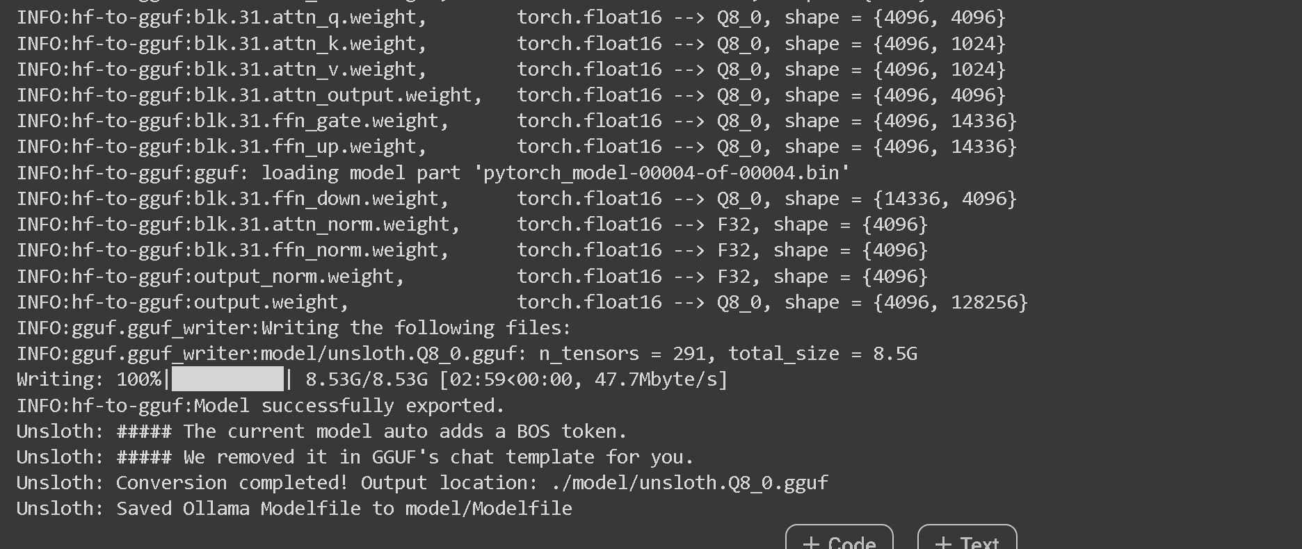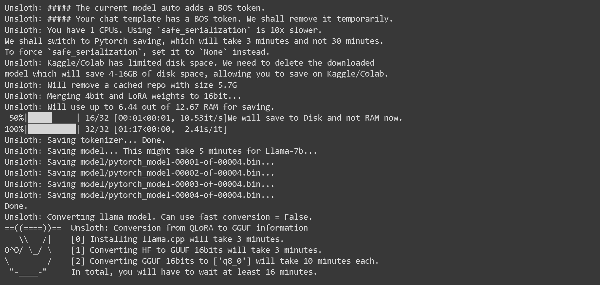 Then we export the finetuned model we have to llama.cpp's GGUF formats like below: