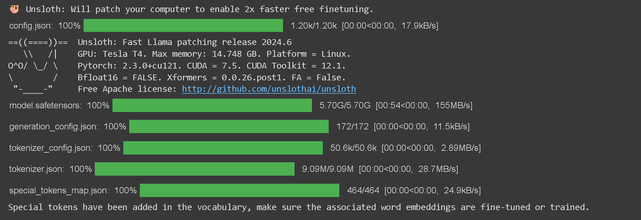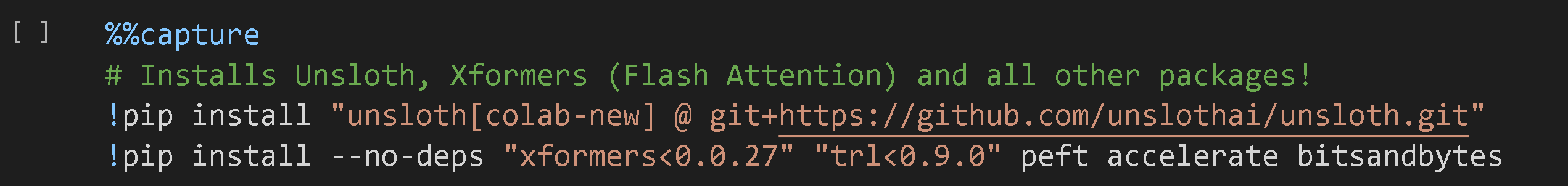 If you run the cell, you will get some print outs of the Unsloth version, which model you are using, how much memory your GPU has, and some other statistics. Ignore this for now.