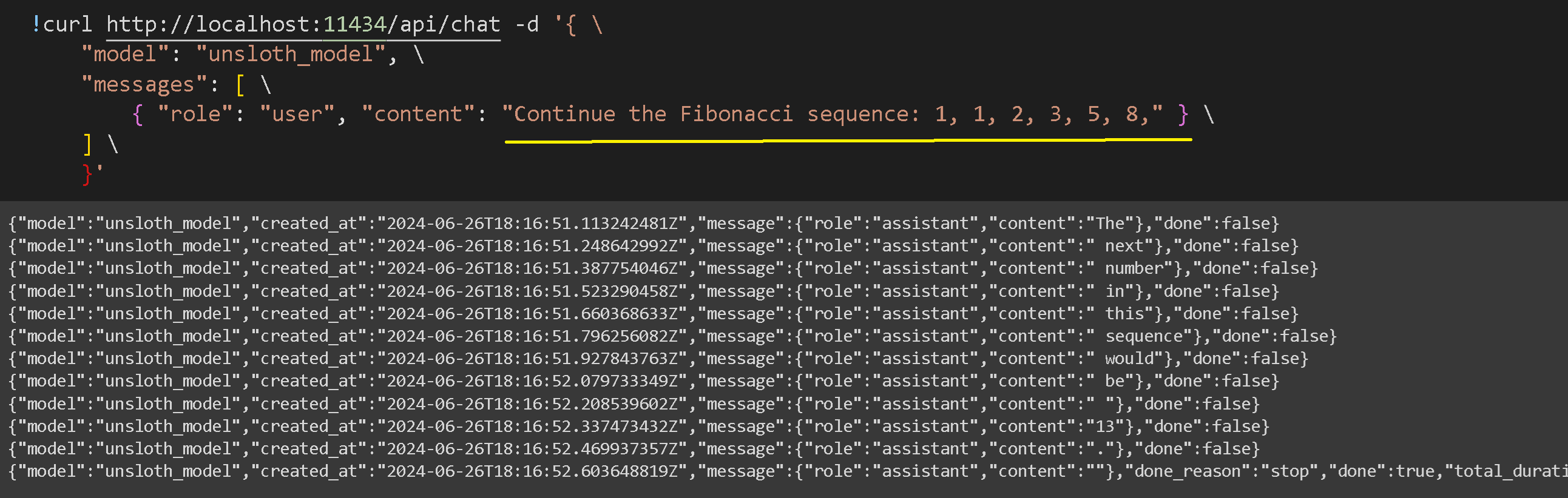 And we can now call the model for inference if you want to do call the Ollama server itself which is running on your own local machine / in the free Colab notebook in the background. Remember you can edit the yellow underlined part.