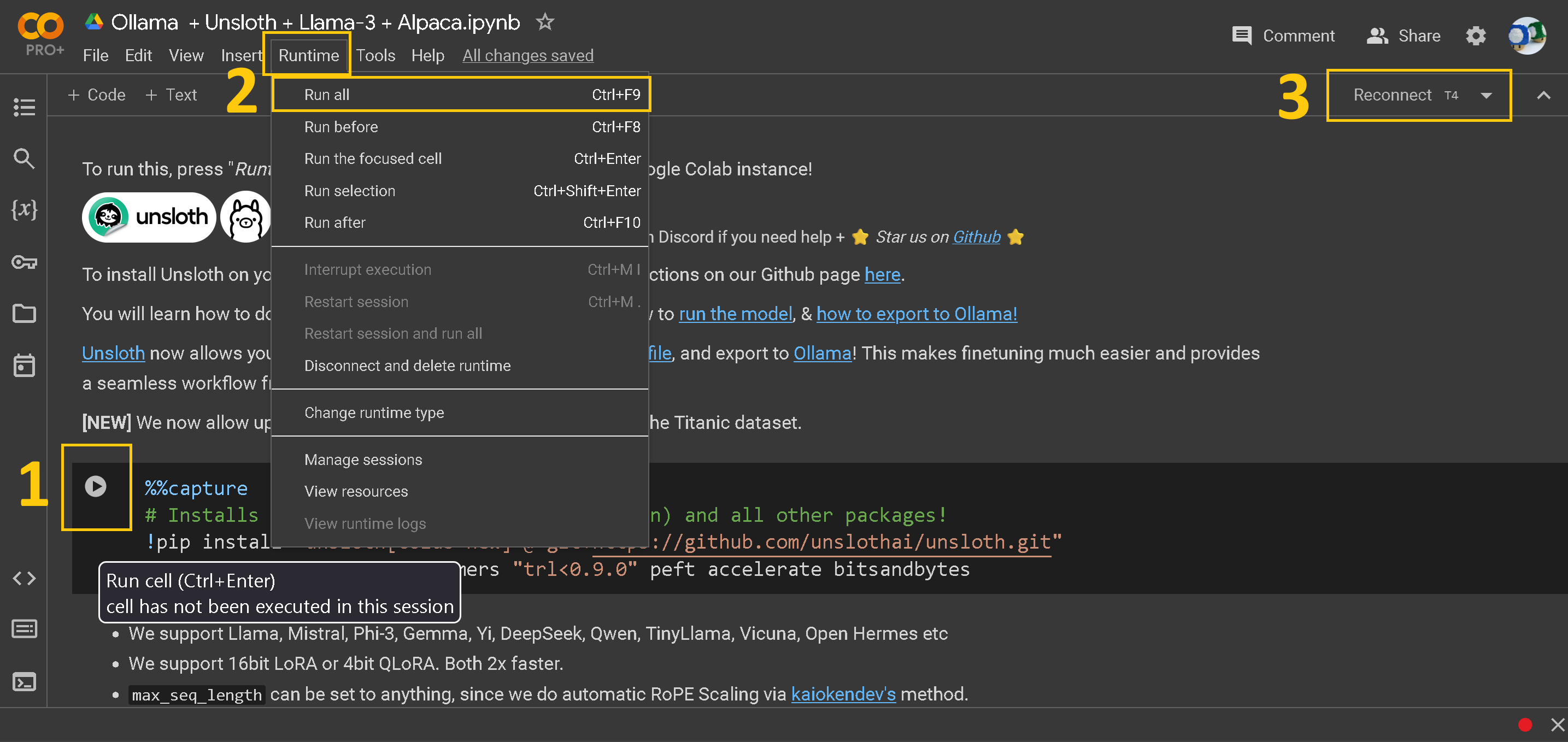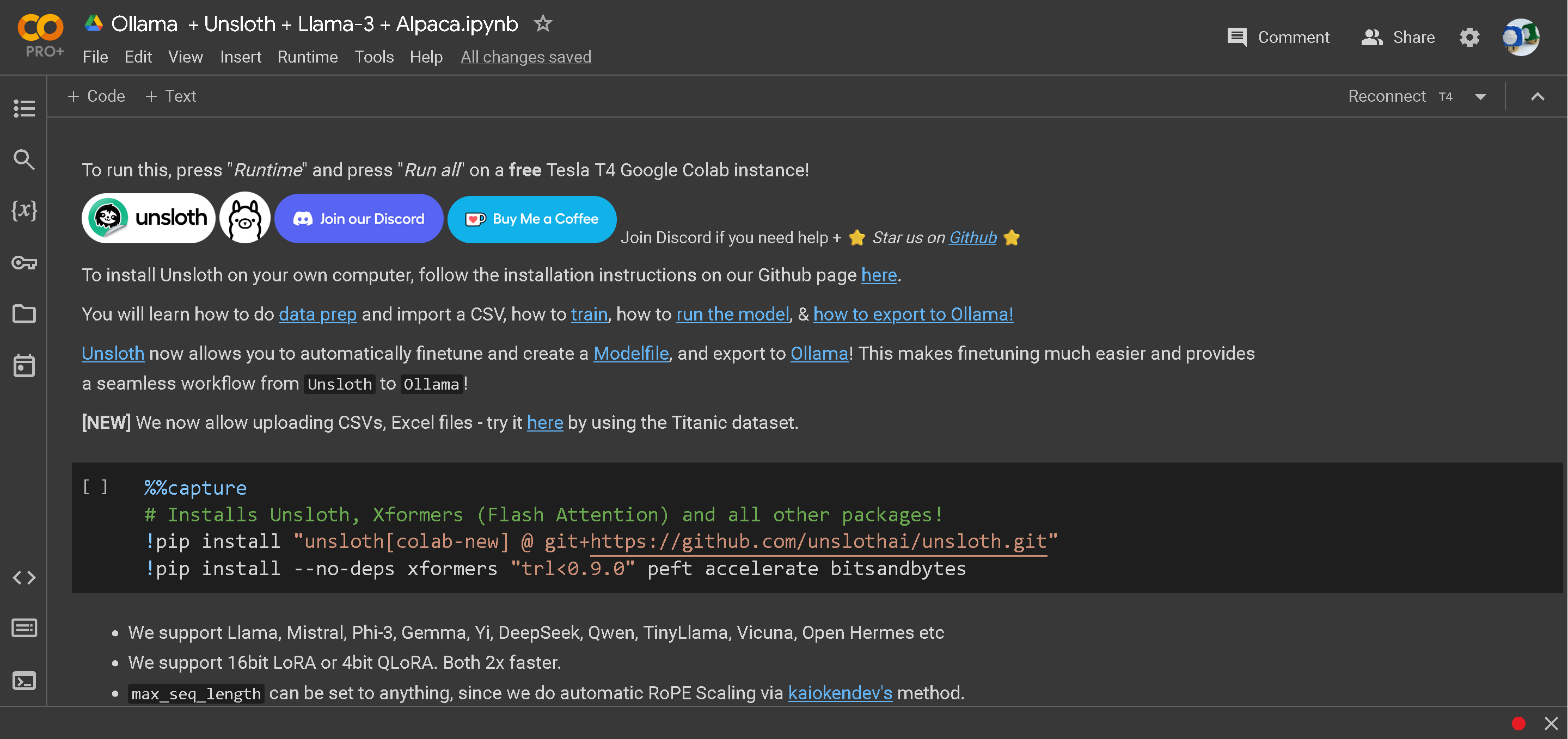 * [Ollama Llama-3 Alpaca](https://colab.research.google.com/github/unslothai/notebooks/blob/main/nb/Llama3_\(8B\)-Ollama.ipynb) (notebook which we will be using)