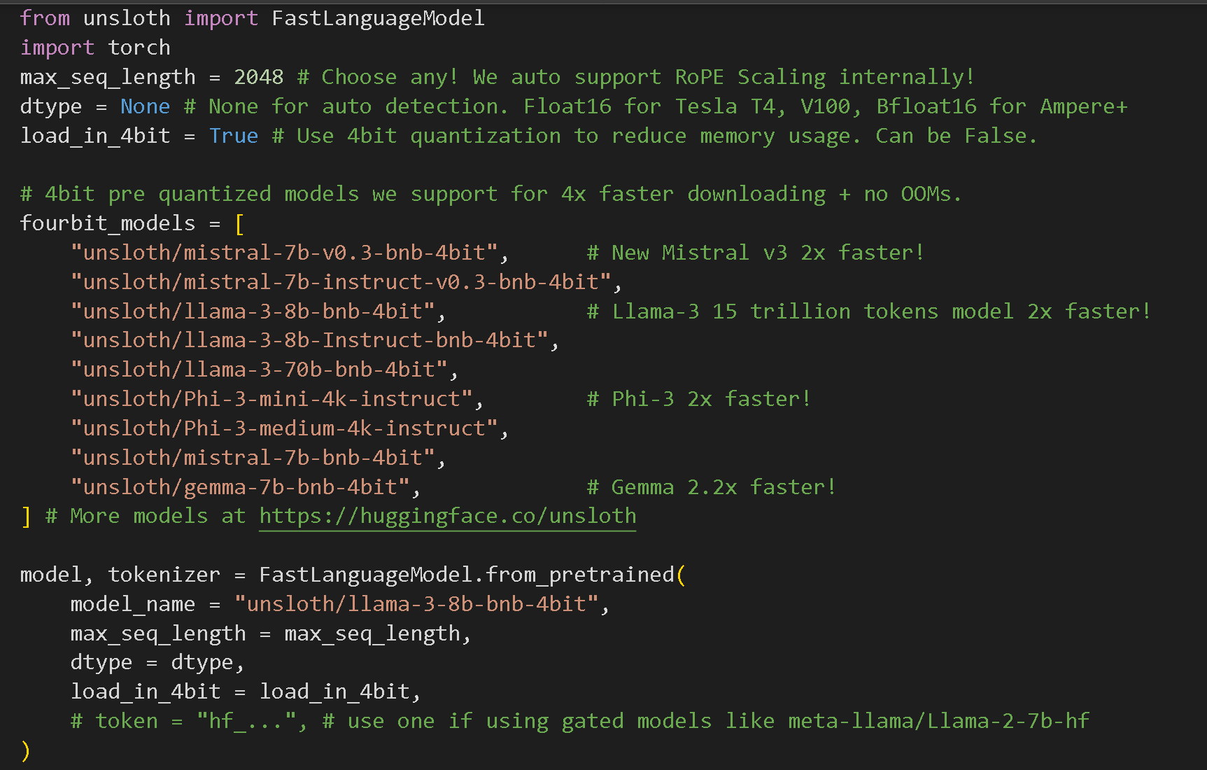 We do finetuning in 4 bit quantization. This reduces memory usage by 4x, allowing us to actually do finetuning in a free 16GB memory GPU. 4 bit quantization essentially converts weights into a limited set of numbers to reduce memory usage. A drawback of this is there is a 1-2% accuracy degradation. Set this to False on larger GPUs like H100s if you want that tiny extra accuracy.