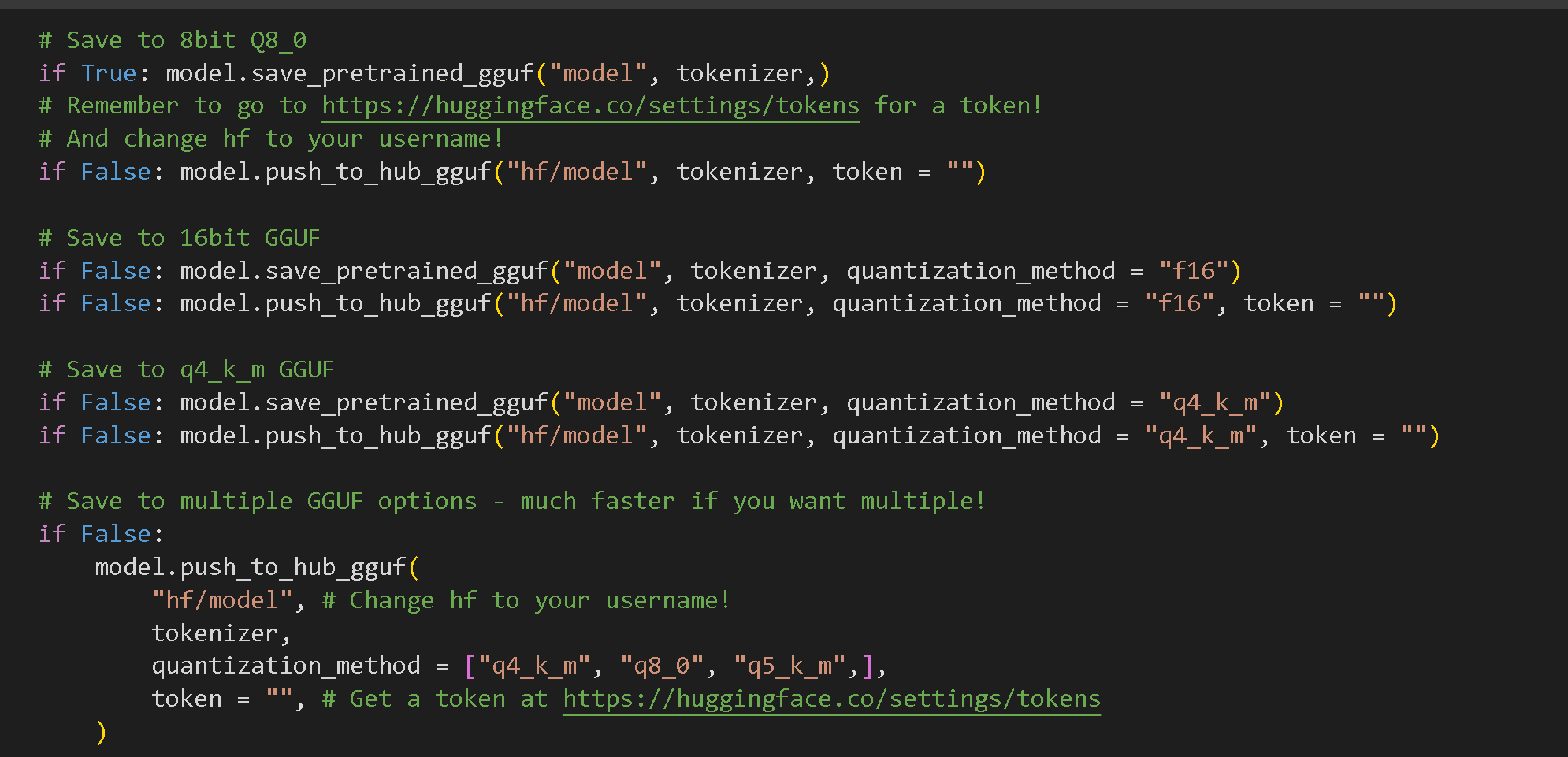Reminder to convert `False` to `True` for 1 row, and not change every row to `True`, or else you'll be waiting for a very time! We normally suggest the first row getting set to `True`, so we can export the finetuned model quickly to `Q8_0` format (8 bit quantization). We also allow you to export to a whole list of quantization methods as well, with a popular one being `q4_k_m`.