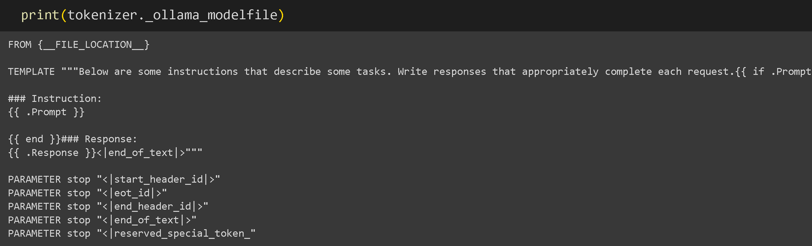 The trick Unsloth provides is we automatically create a `Modelfile` which Ollama requires! This is a just a list of settings and includes the chat template which we used for the finetune process! You can also print the `Modelfile` generated like below: