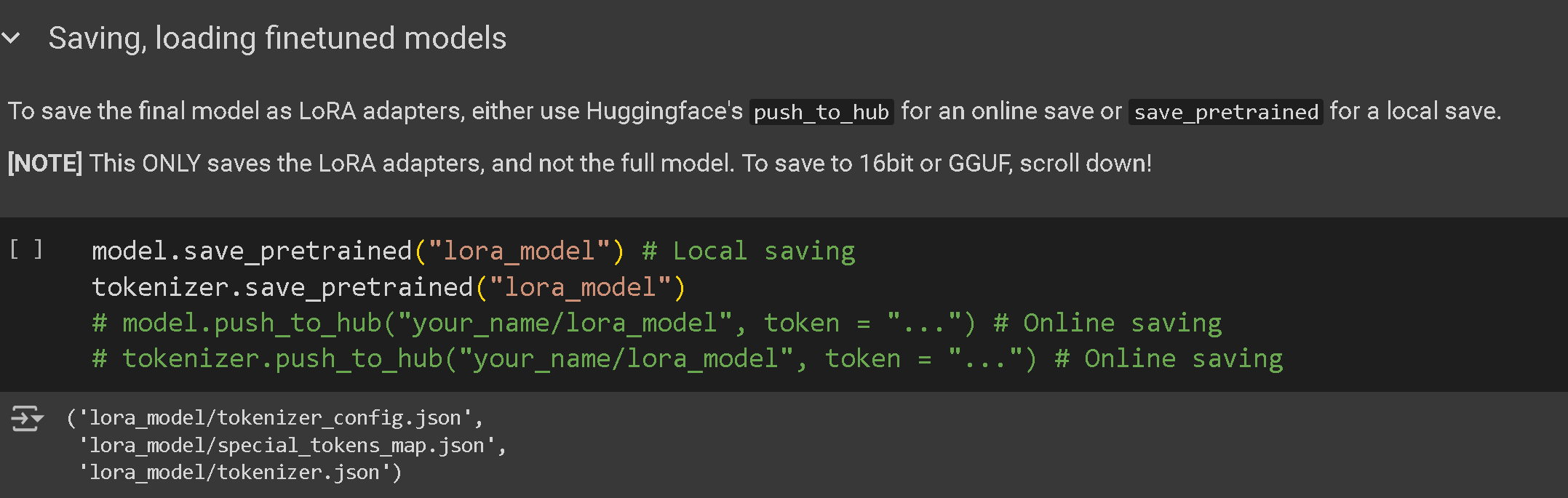 We can now save the finetuned model as a small 100MB file called a LoRA adapter like below. You can instead push to the Hugging Face hub as well if you want to upload your model! Remember to get a Hugging Face token via <https://huggingface.co/settings/tokens> and add your token!