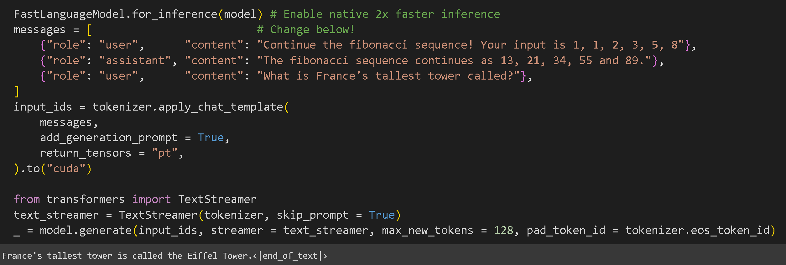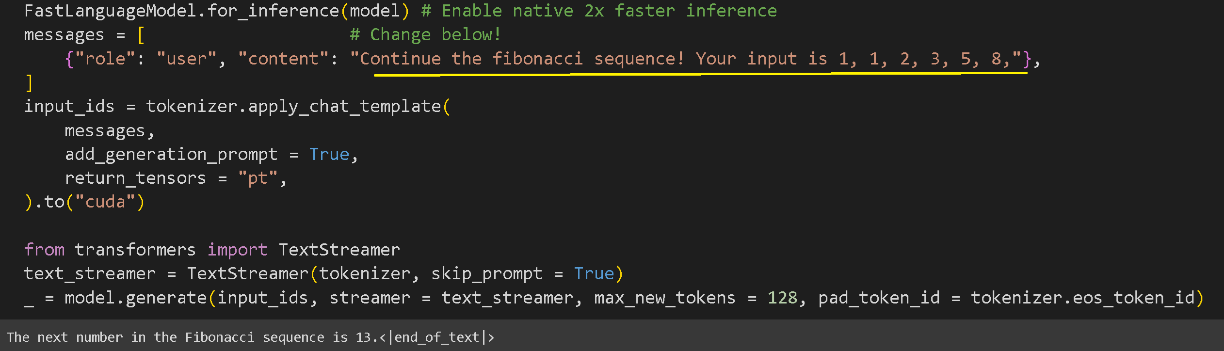 Reminder Unsloth itself provides **2x faster inference** natively as well, so always do not forget to call `FastLanguageModel.for_inference(model)`. If you want the model to output longer responses, set `max_new_tokens = 128` to some larger number like 256 or 1024. Notice you will have to wait longer for the result as well!