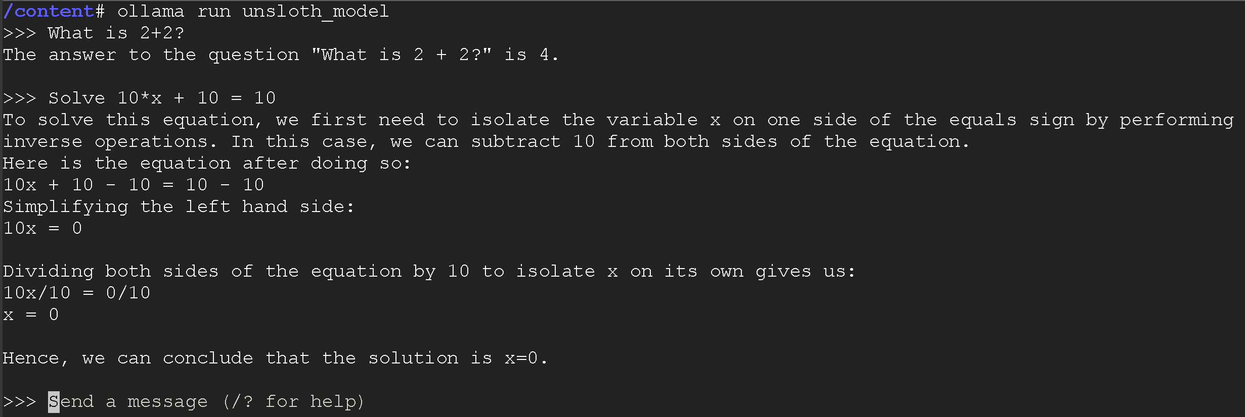 Then, you might have to press ENTER twice to remove some weird output in the Terminal window. Wait a few seconds and type `ollama run unsloth_model` then hit ENTER.