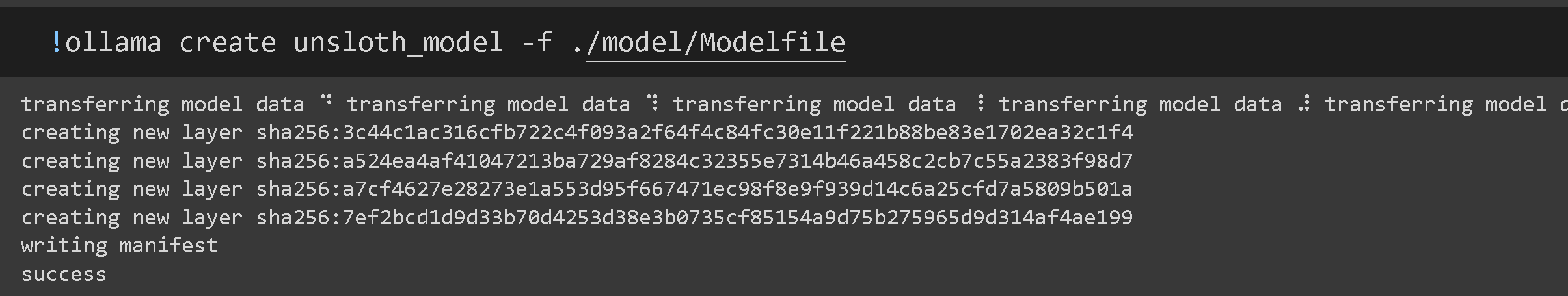 **If you’d like to copy or save the code, everything is available in our** [**Ollama Colab notebook**](https://colab.research.google.com/github/unslothai/notebooks/blob/main/nb/Llama3_\(8B\)-Ollama.ipynb)**. You can use it directly there or adapt it for your local setup:** [**https://colab.research.google.com/github/unslothai/notebooks/blob/main/nb/Llama3\_(8B)-Ollama.ipynb**](https://colab.research.google.com/github/unslothai/notebooks/blob/main/nb/Llama3_\(8B\)-Ollama.ipynb)