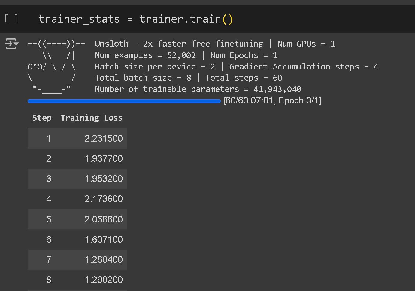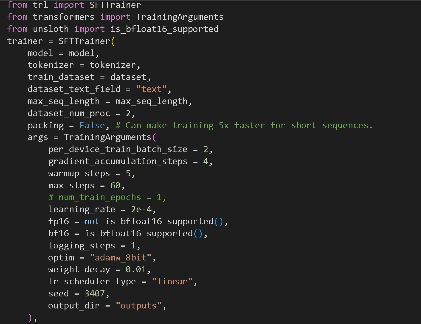 We set steps to 60 for faster training. For full training runs which can take hours, instead comment out `max_steps`, and replace it with `num_train_epochs = 1`. Setting it to 1 means 1 full pass over your dataset. We normally suggest 1 to 3 passes, and no more, otherwise you will over-fit your finetune.