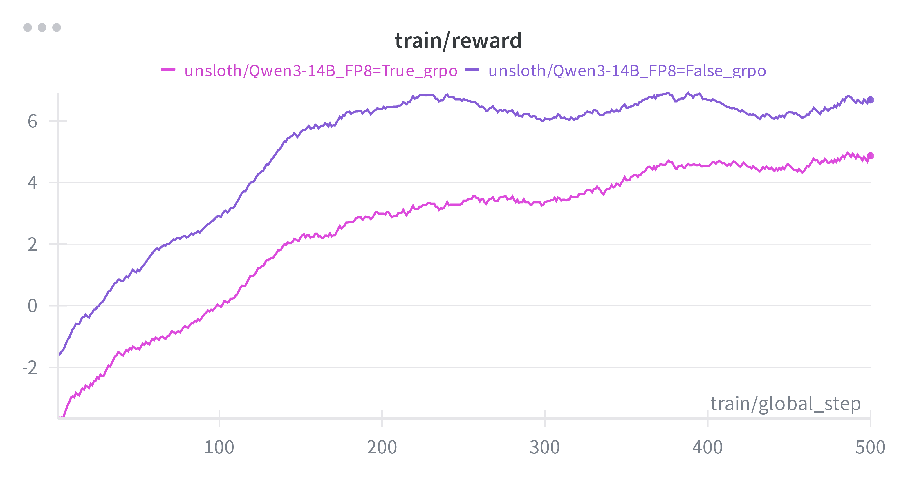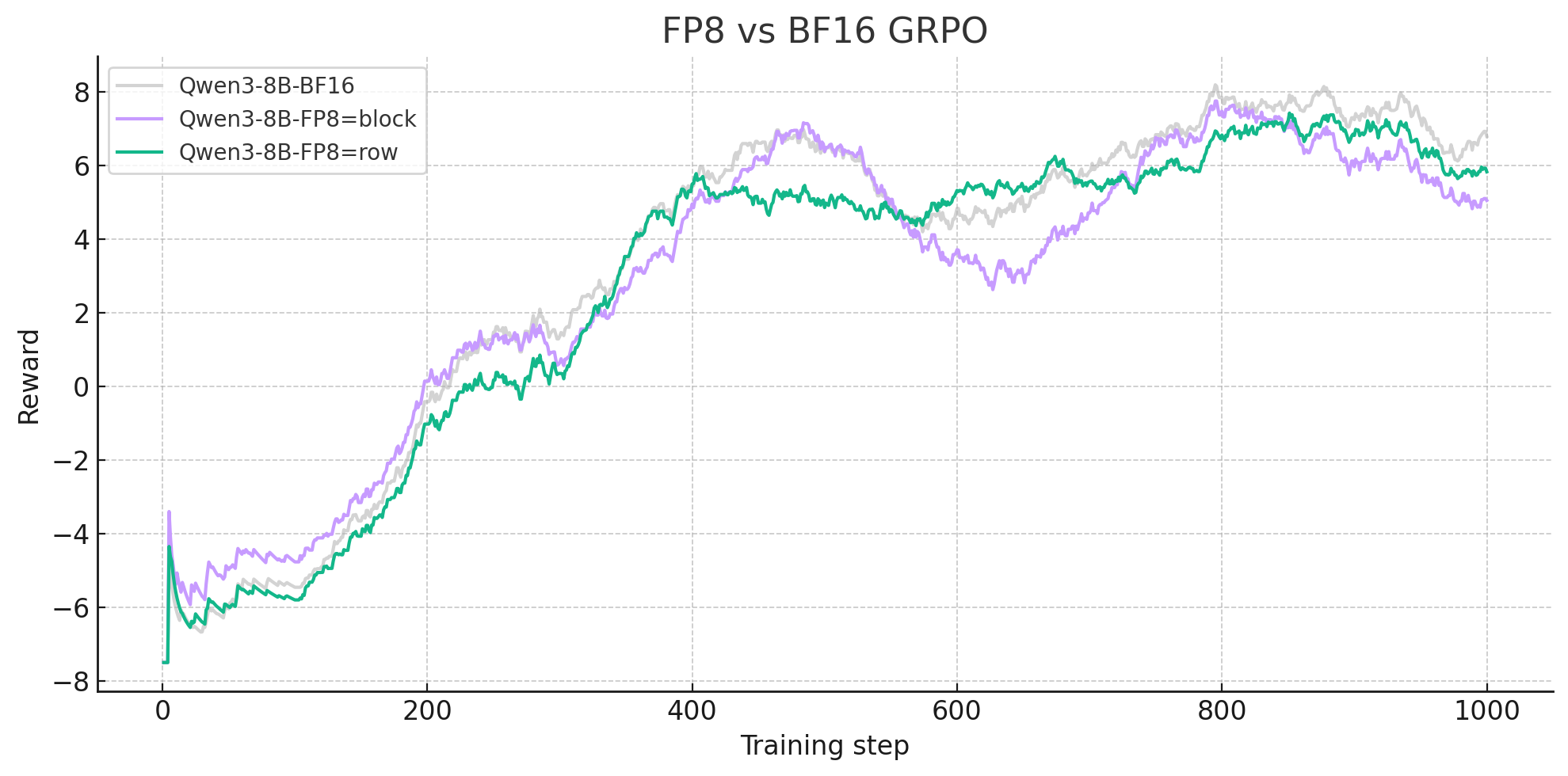 <figure><img src="https://3215535692-files.gitbook.io/~/files/v0/b/gitbook-x-prod.appspot.com/o/spaces%2FxhOjnexMCB3dmuQFQ2Zq%2Fuploads%2FNhbi7jRc6zwCAeuddBBk%2Foutput(14).png?alt=media&#x26;token=80ad0712-4626-4536-aa57-29bc53b40540" alt="" width="375"><figcaption><p>Reward plot shows FP8 following the same trend as BF16</p></figcaption></figure>