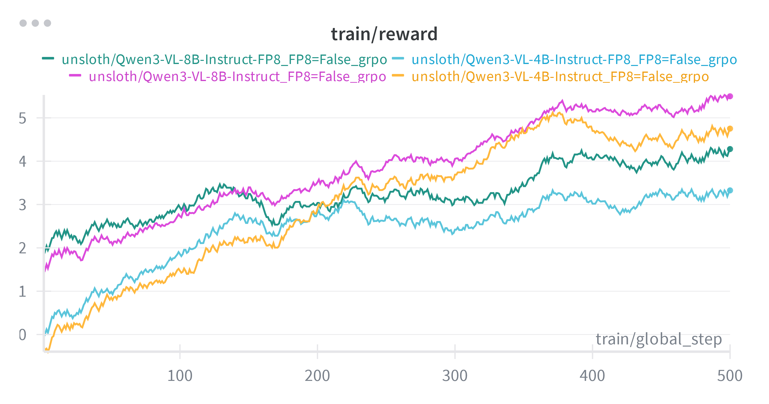 For example for Qwen-3-8B, which is 1.15x faster on shorter sequence lengths, vLLM FP8 itself for inference (without training) throughput is also 1.15x faster. We see our RL run in Unsloth attains also 1.15x faster on tokens processed, showing how **training overhead is negligible in Unsloth.**
