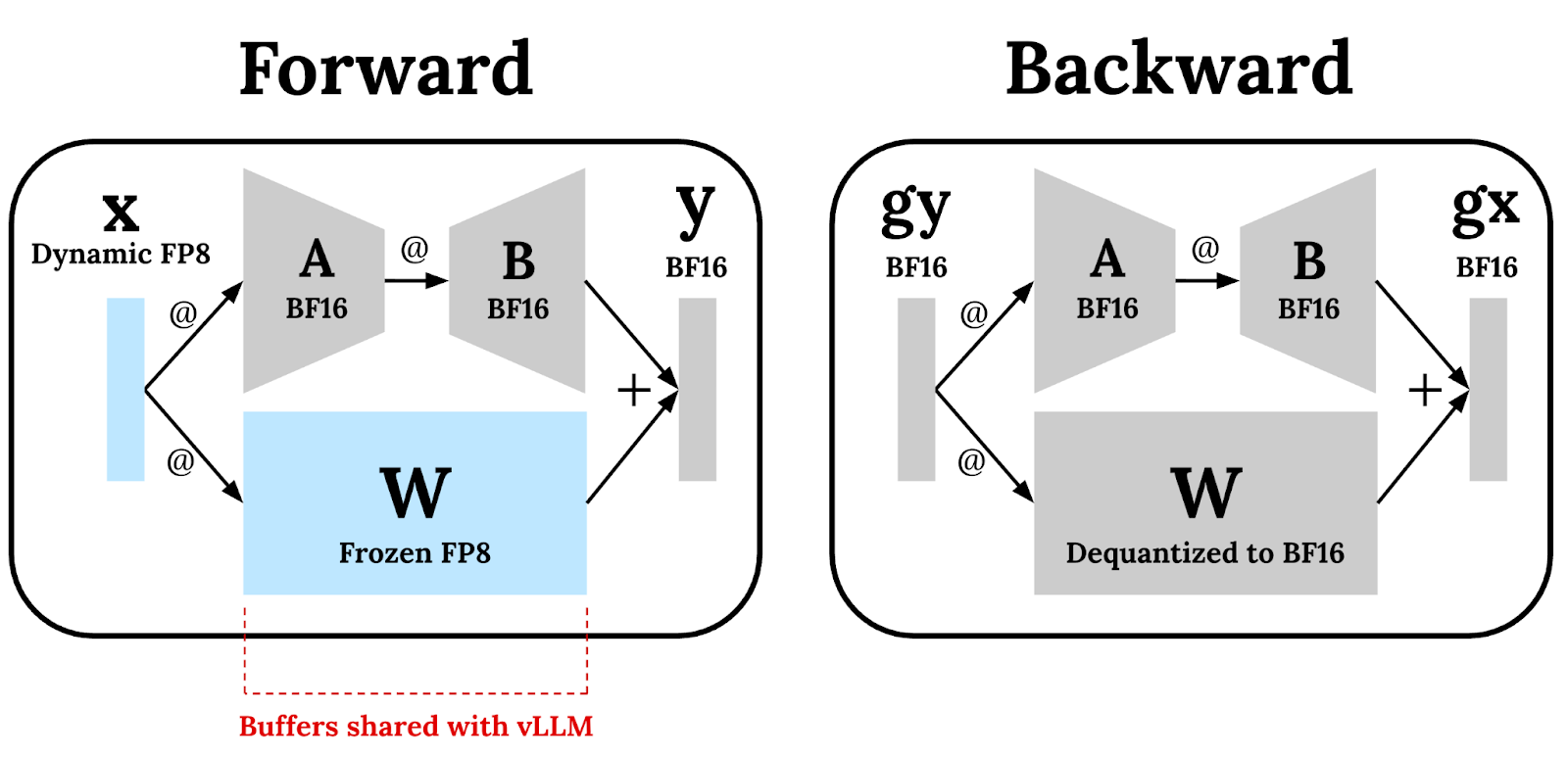 * During the forward pass, we apply dynamic FP8 quantization to the input activations, while keeping the trainable LoRA adapters in BF16.