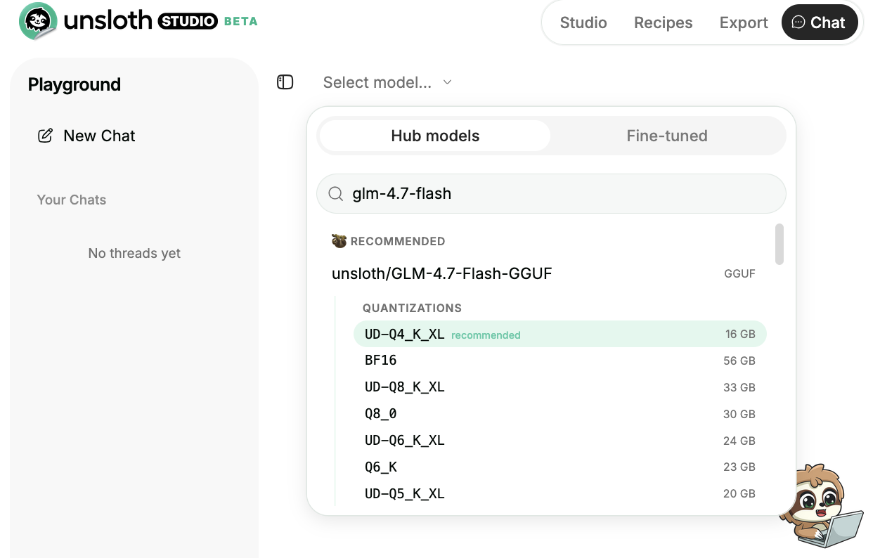 Then go to the [Studio Chat](https://unsloth.ai/docs/new/studio/chat) tab and search for **GLM-4.7-Flash** in the search bar and download your desired model and quant.