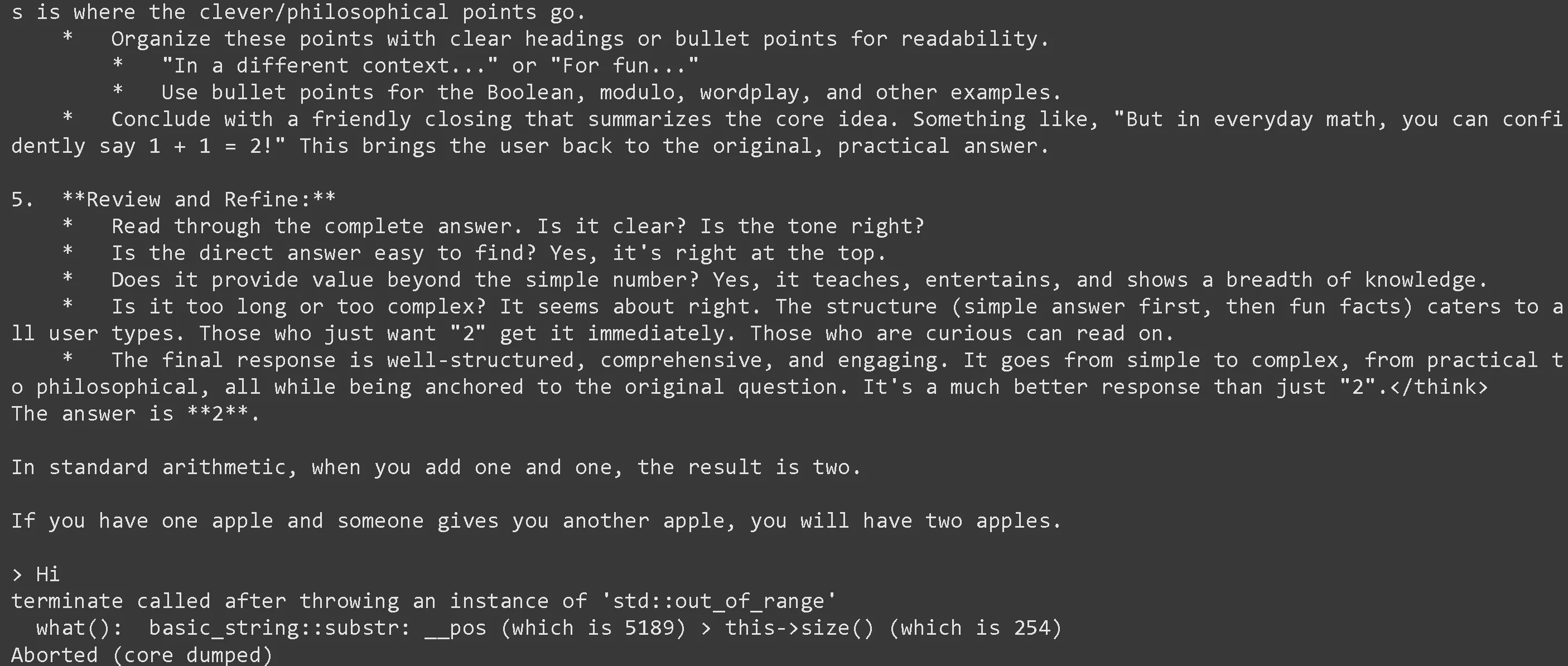 We get reasoning in English and outputs in English! We also ask a follow up of "What is 1+1" and get English only: