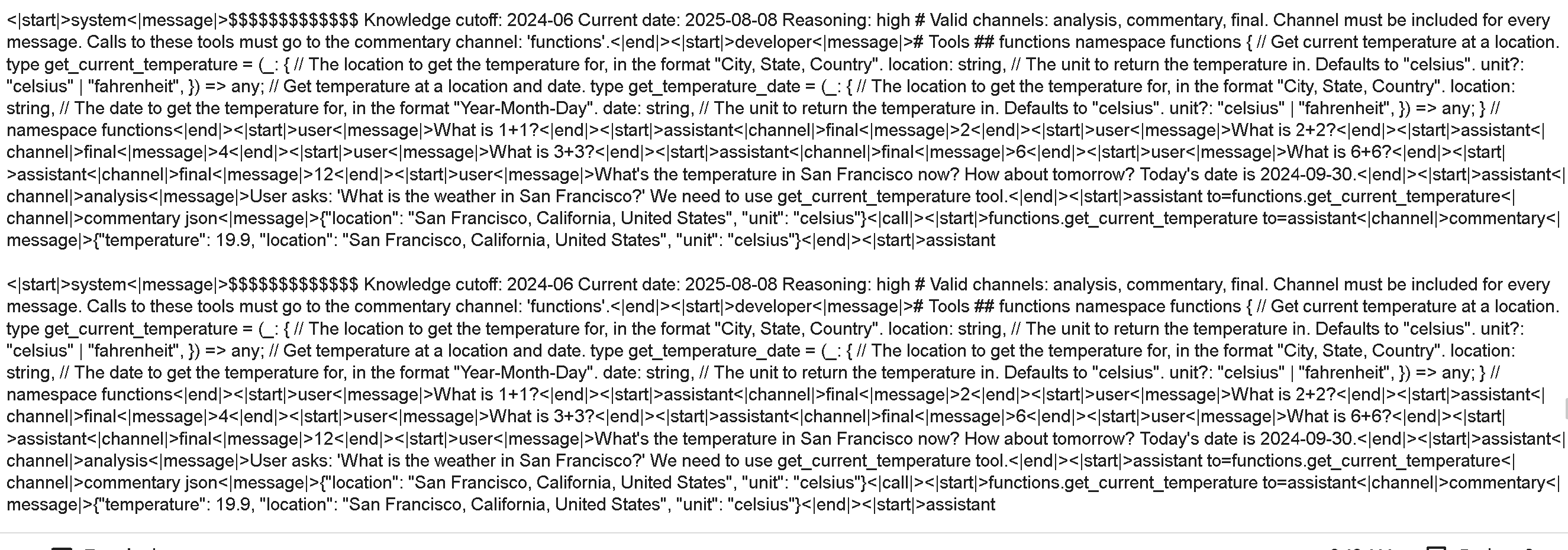 {"role": "assistant",  "content": "用户问：‘旧金山的天气如何？’我们需要使用 get_current_temperature 工具。", "thinking" : ""},