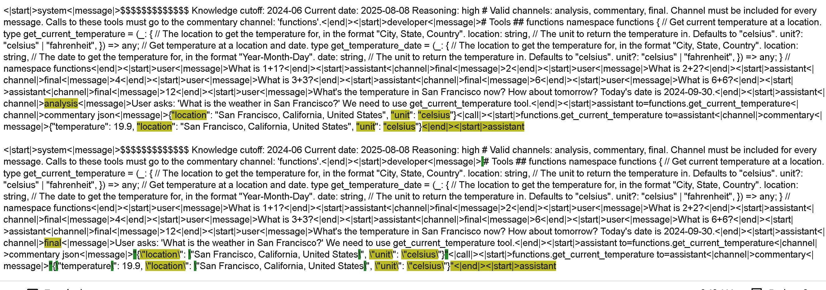 4. 其他聊天模板似乎根本没有使用 `<|channel|>final` ——最终的助手消息应该使用它。你不应将其用于思考轨迹或工具调用。