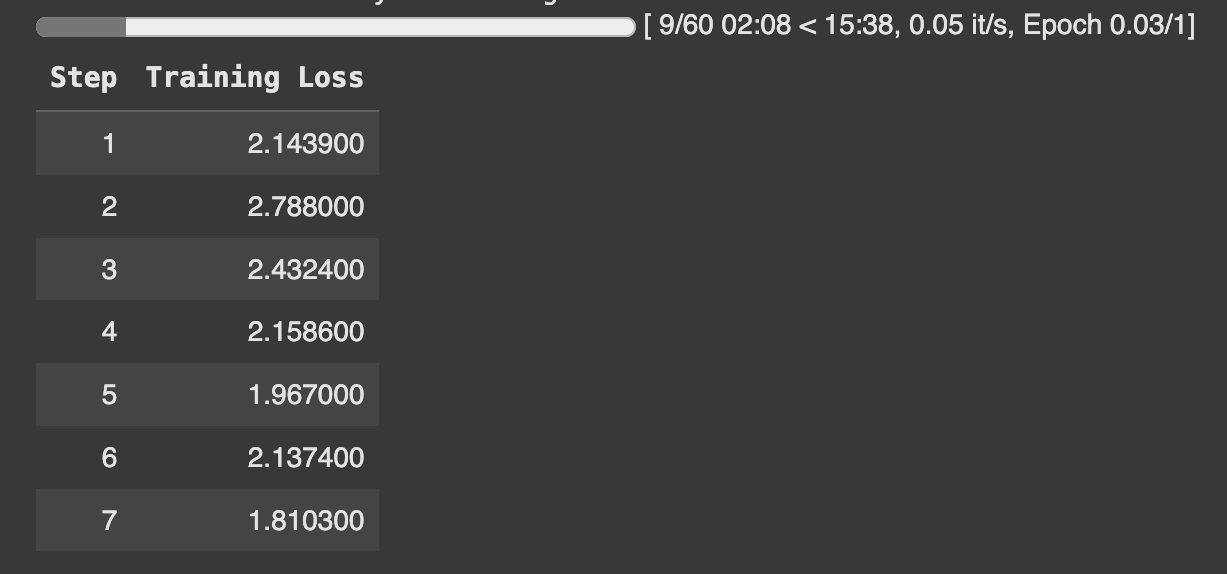 在此示例中，为了加快流程我们训练 60 步。要进行完整训练，请设置 `num_train_epochs=1` 并通过设置 `max_steps=None`.