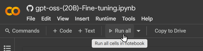 在笔记本中，有一个名为 *“推理强度”* 的部分，演示了 gpt-oss 在 Colab 中的推理运行。你可以跳过此步骤，但在微调完成后仍需要稍后运行模型。