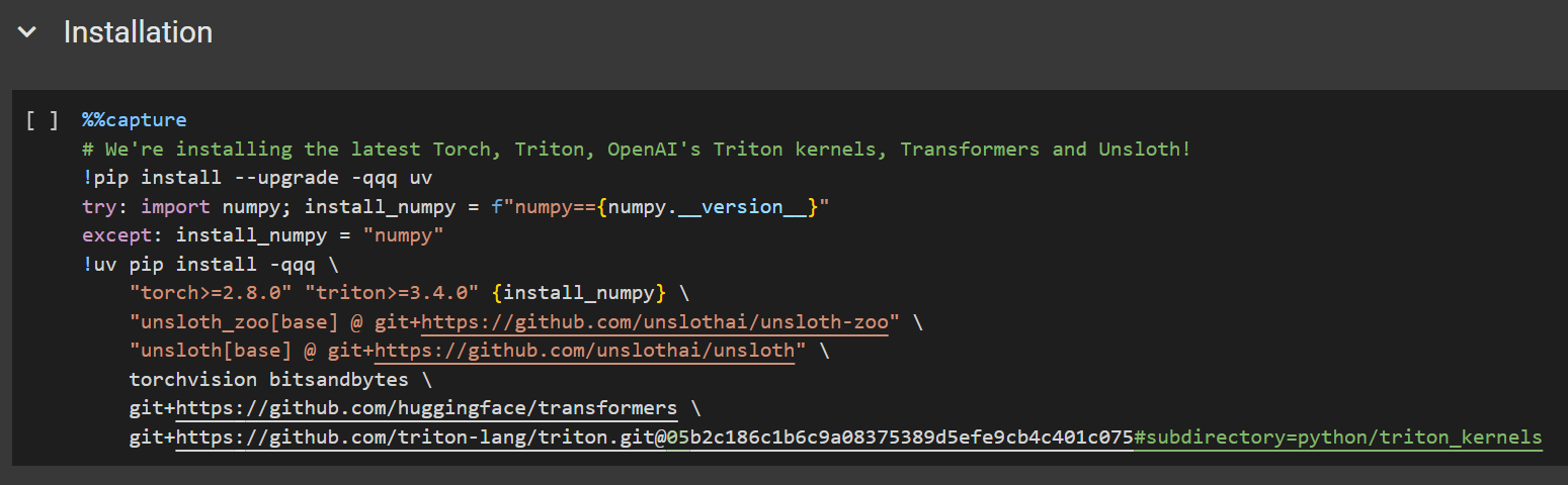 #### 在 Colab 中安装 Unsloth
