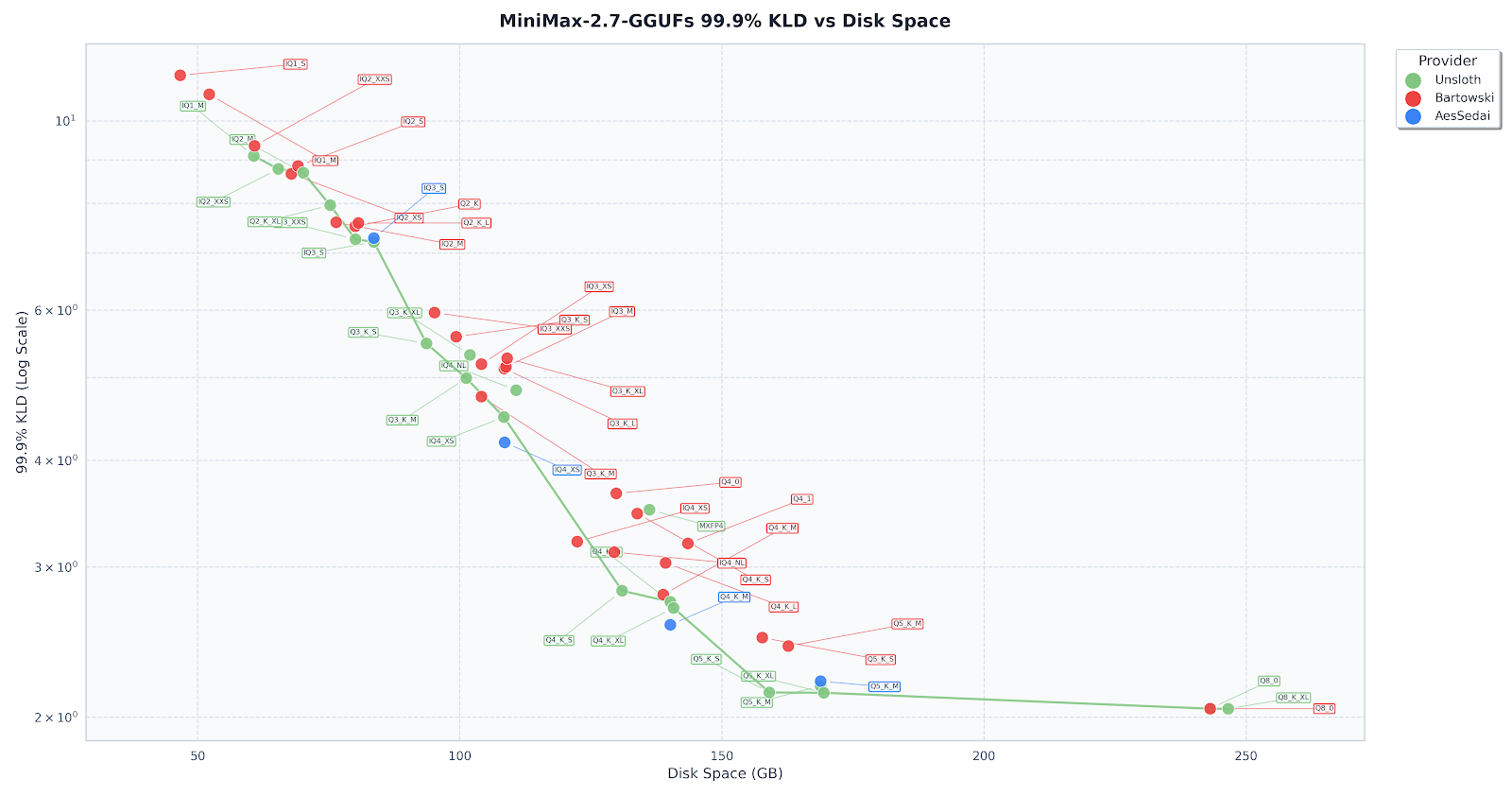 由于 MiniMax-M2.7 使用与 MiniMax-M2.5 相同的架构，M2.7 的 GGUF 量化基准测试应与 M2.5 非常相似。因此，我们也将参考之前针对 M2.5 进行的量化基准测试：