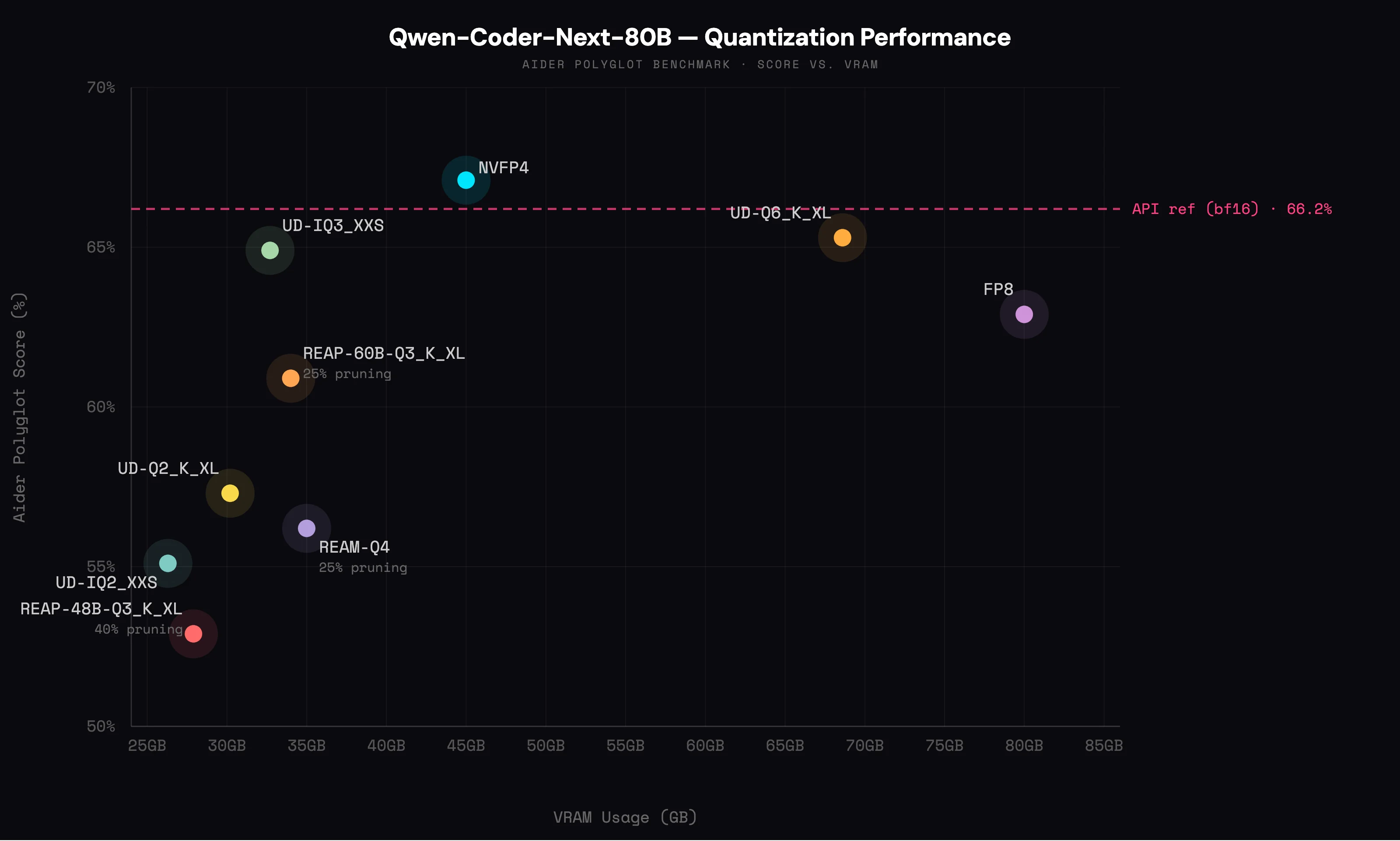 <div><figure><img src="https://2657992854-files.gitbook.io/~/files/v0/b/gitbook-x-prod.appspot.com/o/spaces%2FxhOjnexMCB3dmuQFQ2Zq%2Fuploads%2FAc5D3rcKmF6NjlyoLCXJ%2Fqwen3-coder-next-oddly-usable-at-aggressive-quantization-v0-q9q4nsw11rkg1.webp?alt=media&#x26;token=a92049ff-0bc2-4afa-a281-82bbacbfe42b" alt="" width="563"><figcaption><p>Aider 多语言基准测试</p></figcaption></figure> <figure><img src="https://2657992854-files.gitbook.io/~/files/v0/b/gitbook-x-prod.appspot.com/o/spaces%2FxhOjnexMCB3dmuQFQ2Zq%2Fuploads%2Ftbfnqq8ppzwFbeqPhnw0%2FHAfMRrrXQAALkQb.png?alt=media&#x26;token=9730d4e1-3d4a-4ae6-92bf-32aa6724ab86" alt="" width="450"><figcaption><p>Benjamine Marie 基准测试（<a href="https://x.com/bnjmn_marie/status/2019809651387514947/photo/1">来源</a>)</p></figcaption></figure></div>