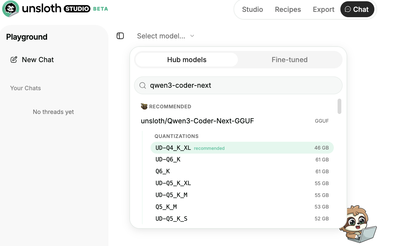 然后前往 [Studio Chat](https://unsloth.ai/docs/zh/xin/studio/chat) 选项卡并搜索 **Qwen3-Coder-Next** ，然后下载你想要的模型和量化版本。