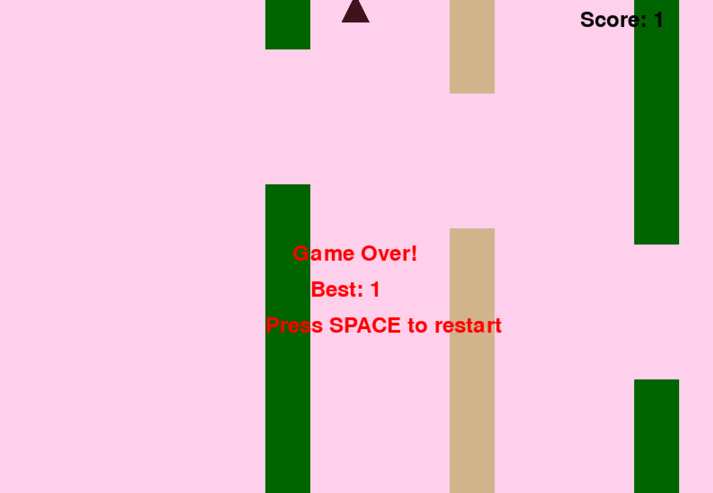--prompt "<|im_start|>user\n用 Python 创建一个 Flappy Bird 游戏。你必须包含以下内容：\n1. 必须使用 pygame。\n2. 背景颜色应随机选择且为浅色调。初始为浅蓝色。\n3. 多次按下 SPACE 会加速小鸟。\n4. 小鸟的形状应在正方形、圆形或三角形中随机选择。颜色应随机选择为深色。\n5. 底部放置一些土地，颜色随机为深棕色或黄色。\n6. 在右上角显示分数。通过管道且未碰撞时增加分数。\n7. 随机间隔生成管道，间距充足。颜色随机为深绿色、浅棕色或深灰色。\n8. 失败时显示最佳分数。将文本显示在屏幕内。按 q 或 Esc 退出游戏。按 SPACE 再次重新开始。\n最终游戏应位于 Python 的 markdown 部分。在最终的 markdown 部分之前检查代码是否有错误并修复。<|im_end|>\n<|im_start|>assistant\n<think>\n"
